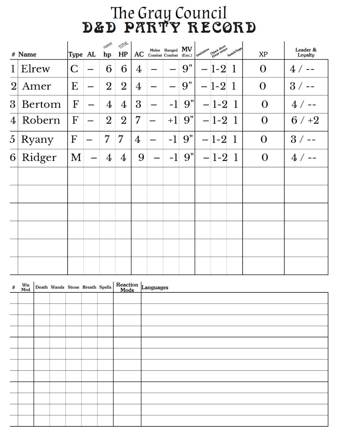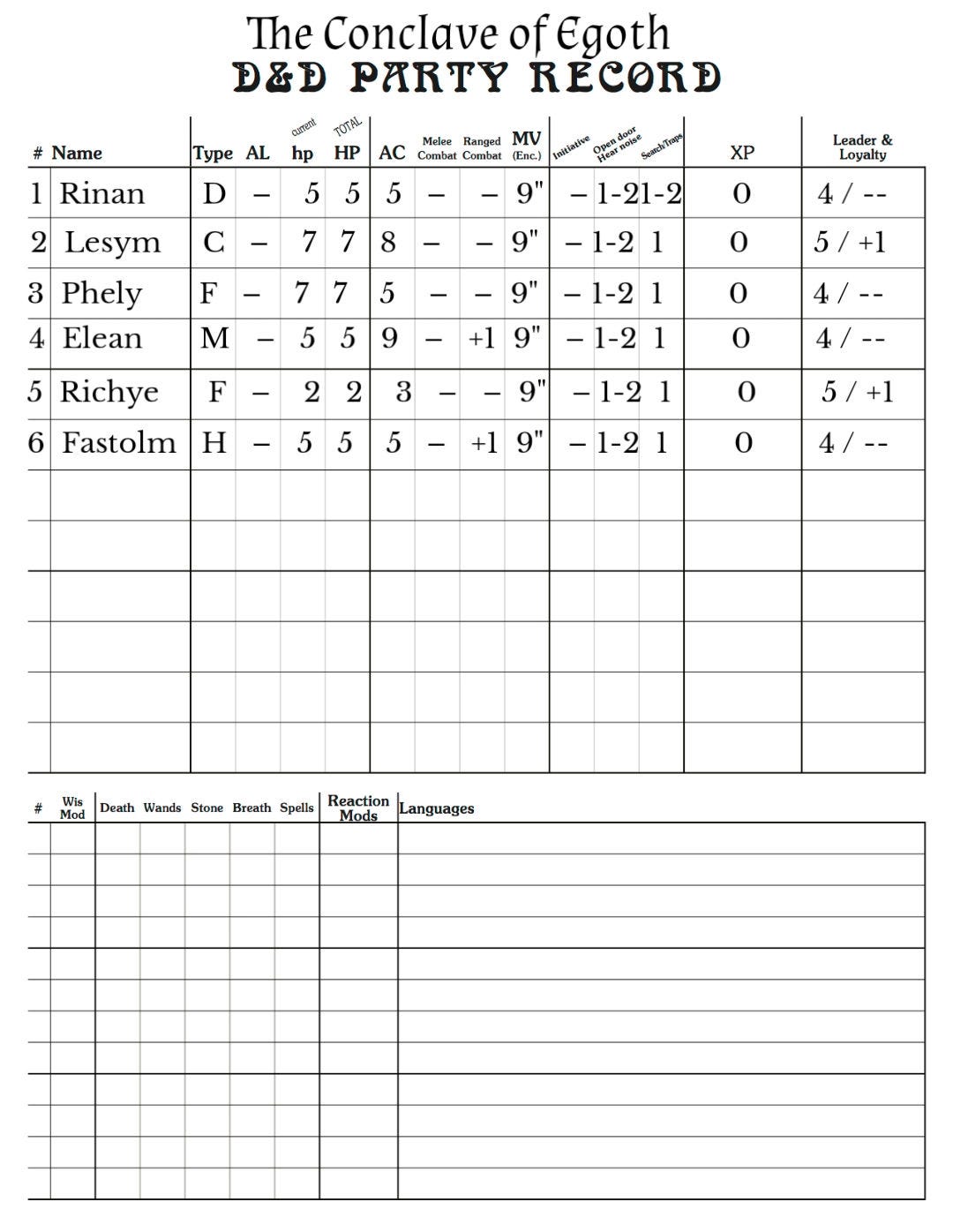 So, I had the urge to create Two Adventuring Parties. Really simple, 3d6 down the line, if a stat hit's a prime requisite for the Class, then that's what they'll be. I put my parties on a Record Sheet…